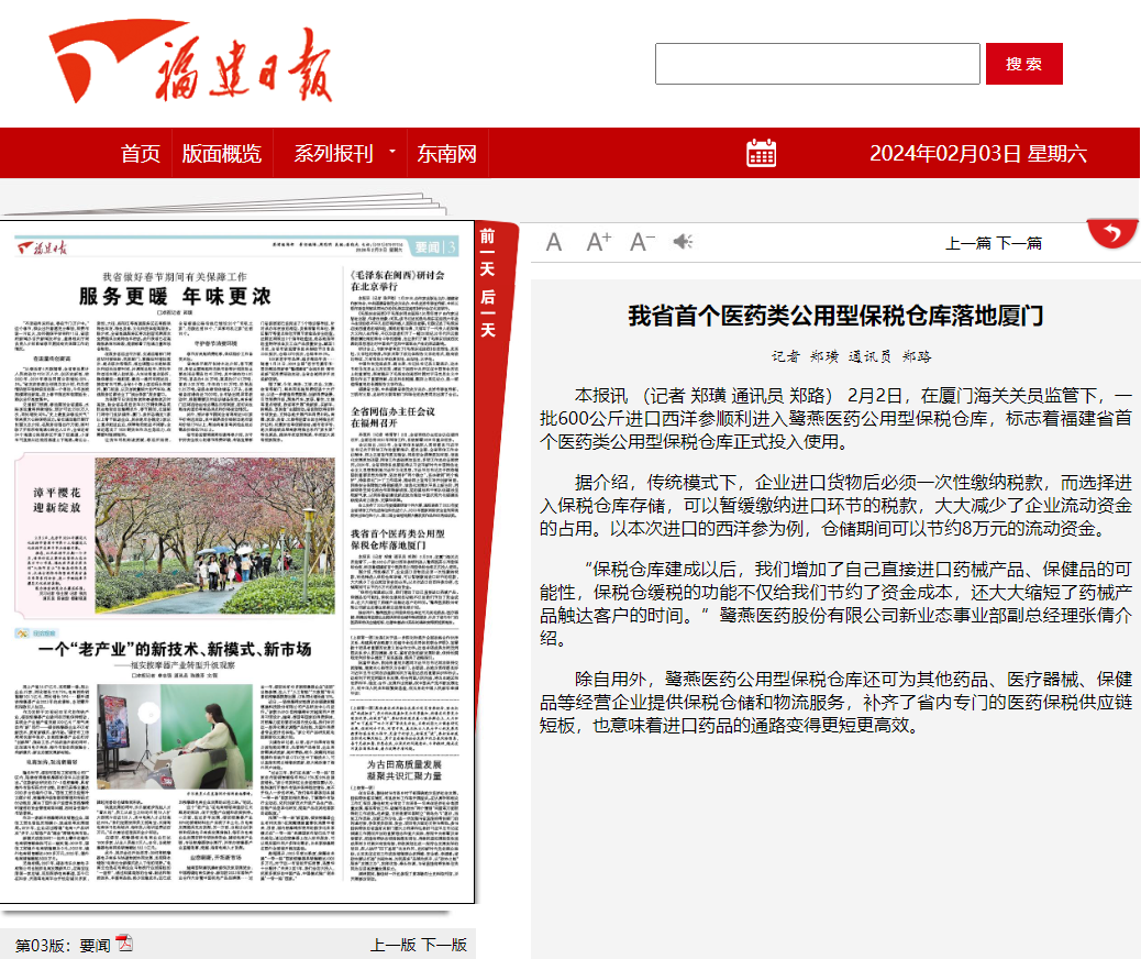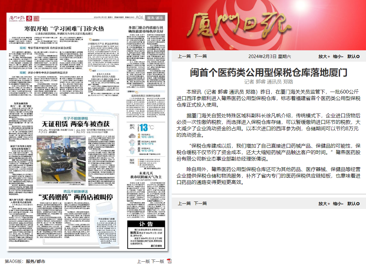 2024年2月2日,鷺燕醫藥公用型保稅倉獲批投用,《福建日報》《廈門日報》相繼報道相關新聞。鷺燕醫藥公用型保稅倉是福建省首個醫藥類公用型保稅倉庫,該保稅倉庫的投用,意味著廈門市乃至福建省補齊了區域內專門的醫藥保稅供應鏈物流服務,也意味著廈門和福建進口藥品的通路變得更短,更為高效。